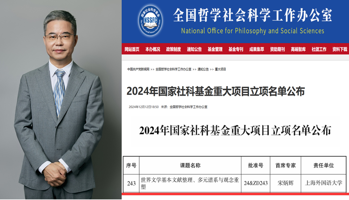 12月12日,全国哲学社会科学工作办公室公布了2024年国家社科基金重大项目立项名单,上海外国语大学申报的2项课题成功获批,其中1项为上外文学研究院宋炳辉教授主持的“世界文学基本文献整理、多元谱系与观念重塑”。